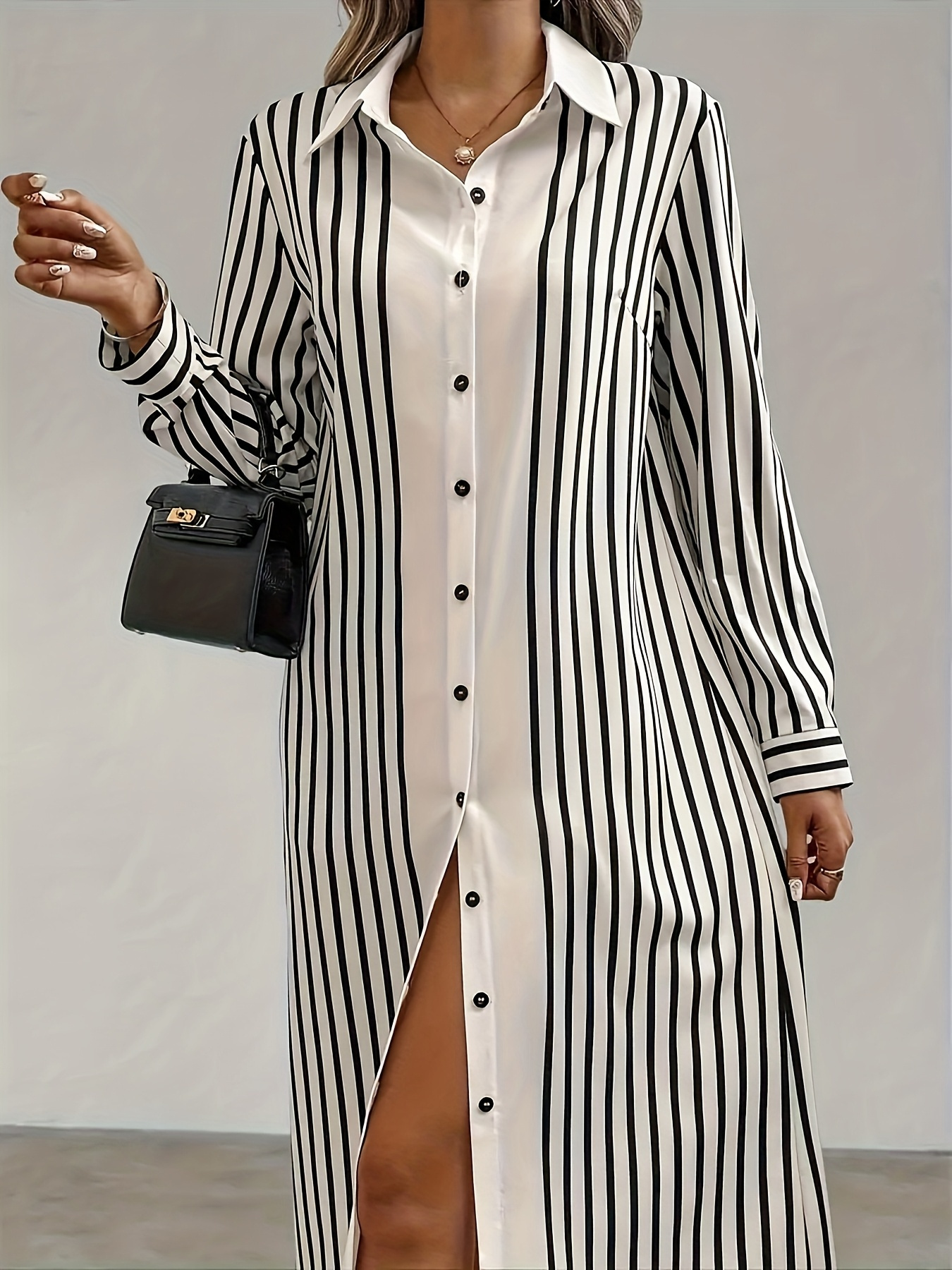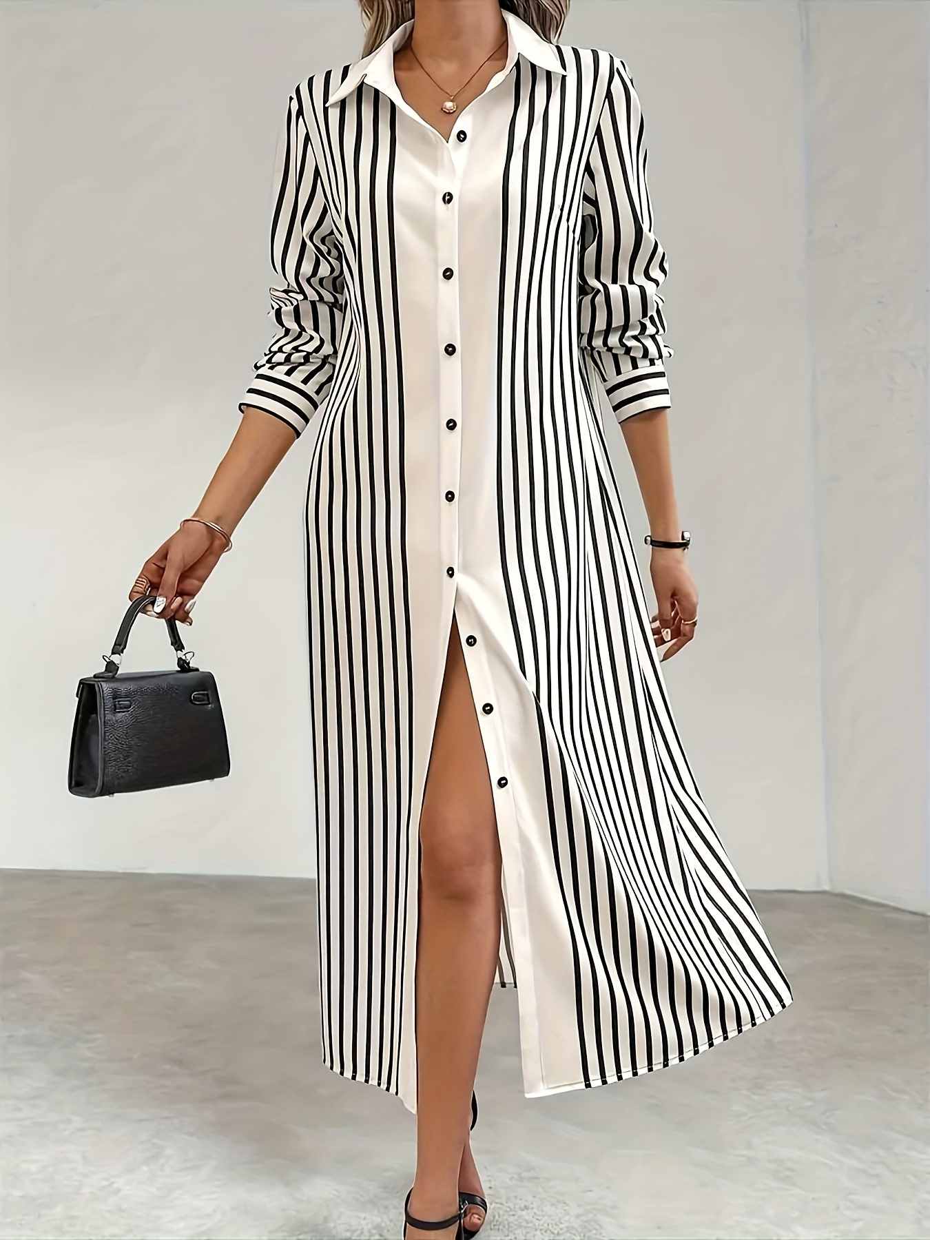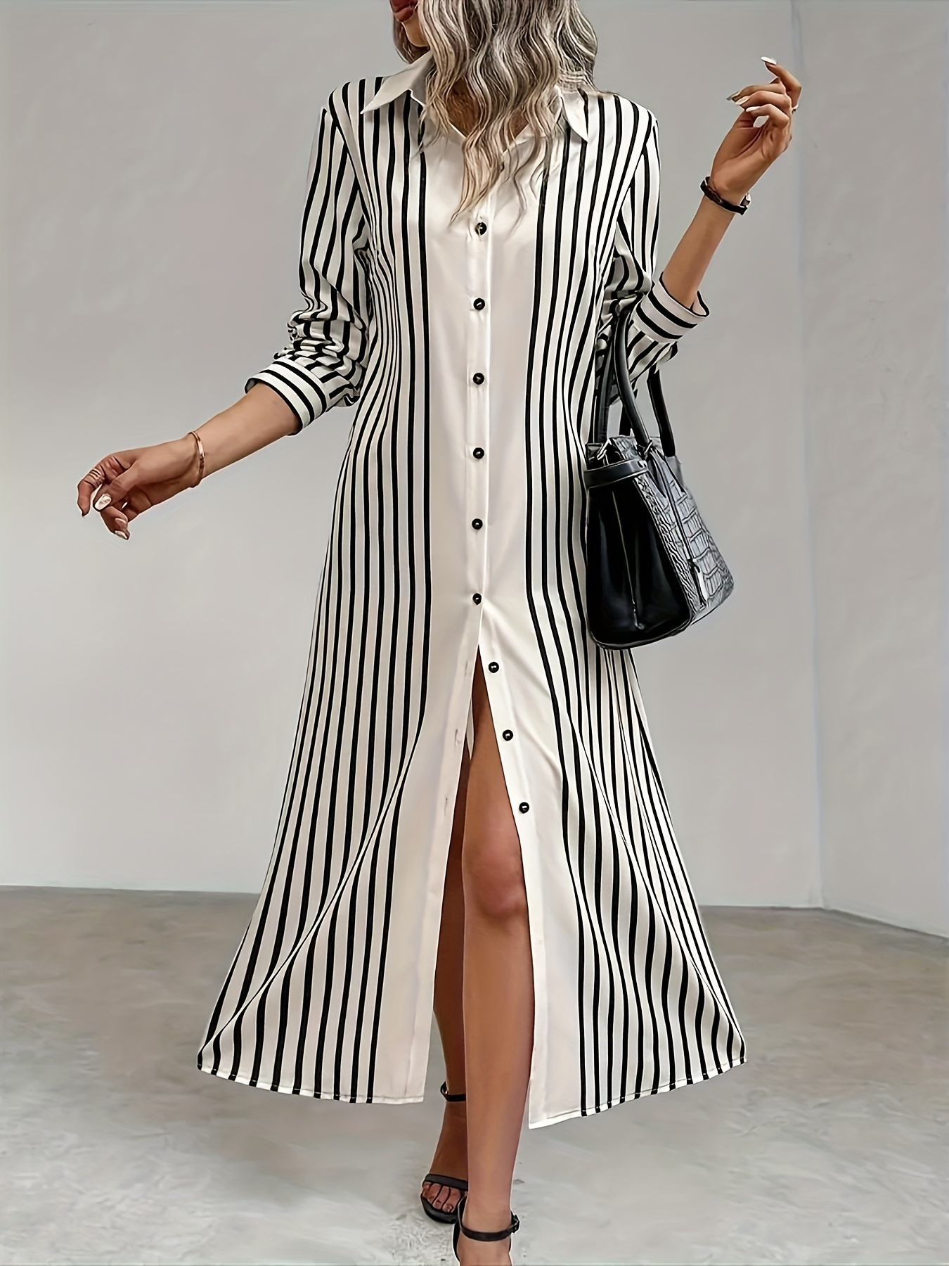 Women's Elegant A-Line Dress with Striped Cardigan & Mid-Length Dress - Asymmetrical Hem, Collar, Loose Fit, A-Line Silhouette, Straight Sleeve Cardigan for Spring/Autumn Wear, Machine Washable Dress Suitable for, Semi-Formal Events