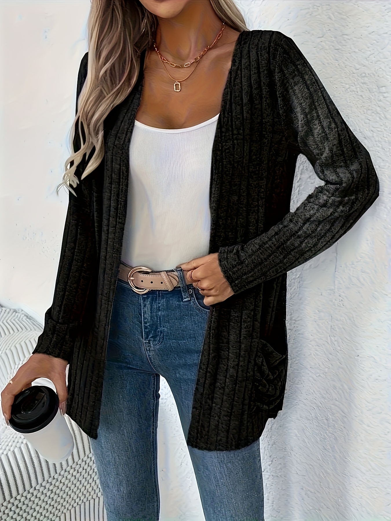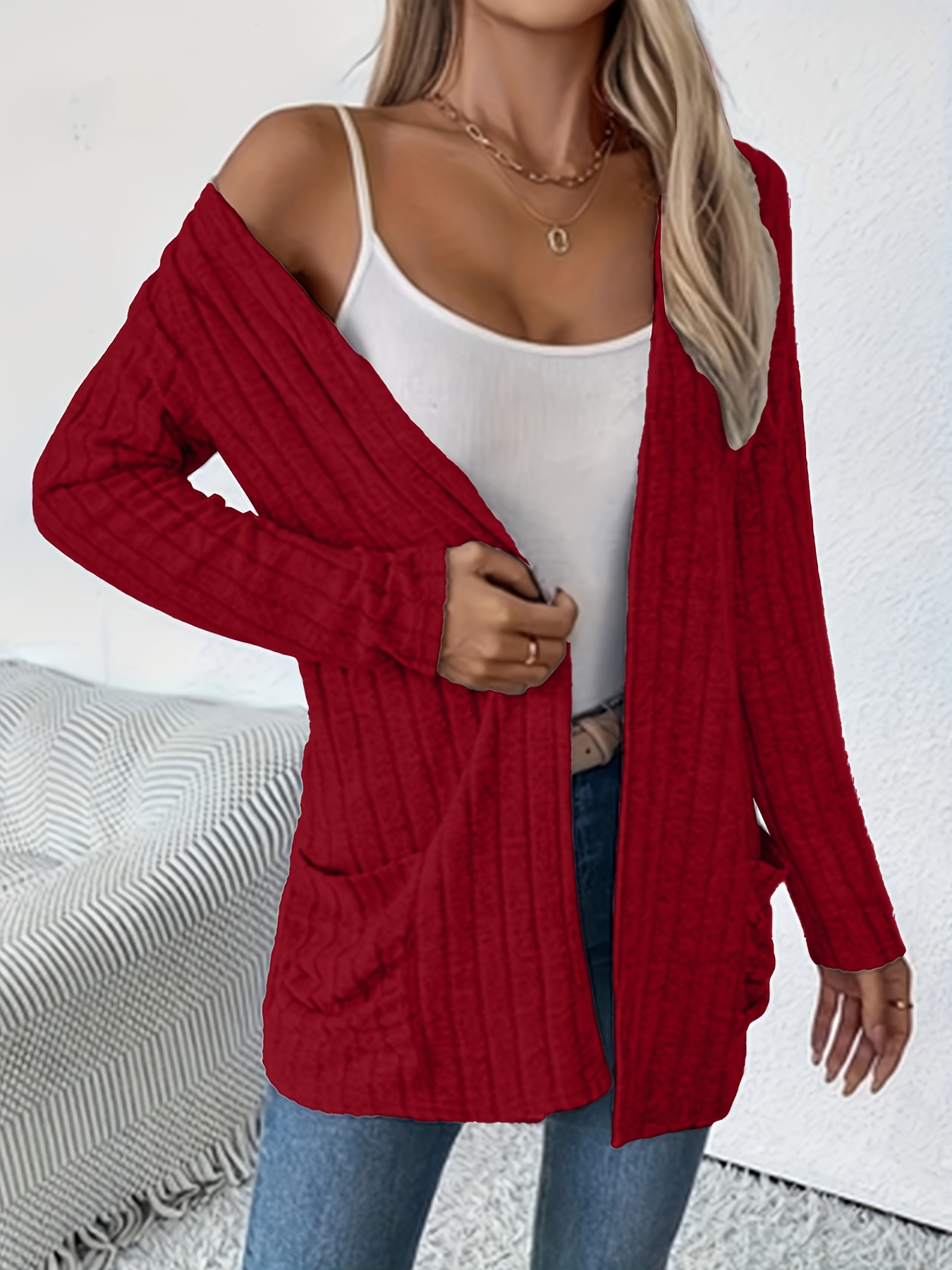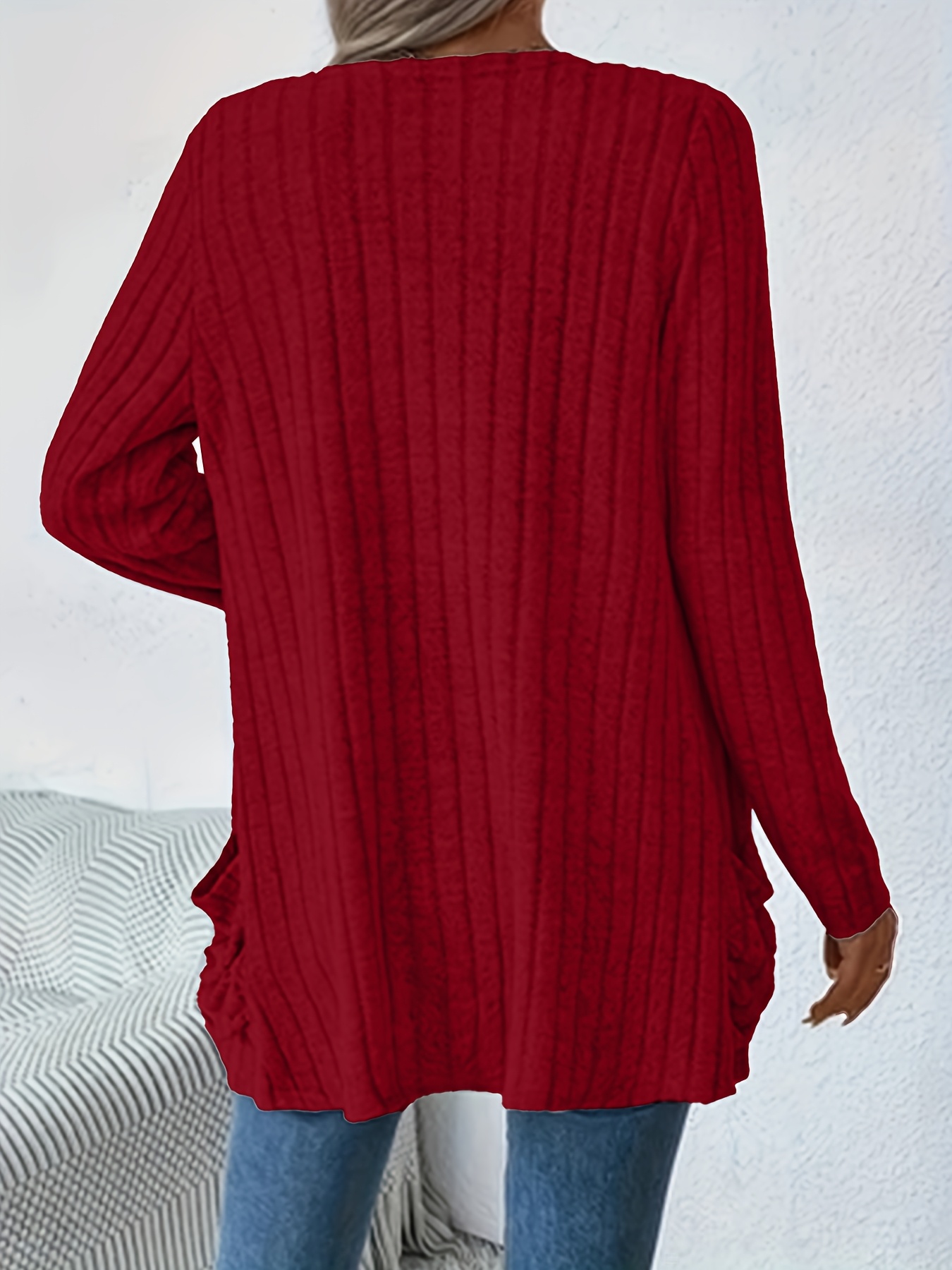 Women'S Elegant Solid Color Cardigan with Pockets - Long Sleeve, Crew Neck, Ribbed Knit Open Front Sweater for Spring & Fall, Plus Size Friendly, Sweater Front Opening | Ribbed Texture Design | Open front cardigan, Sweater Cardiga
