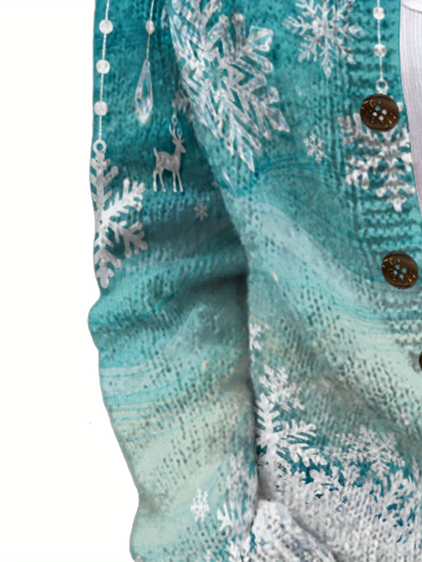 Women's Plus Size 0XL-6XL Turquoise & White Snowflake Button-Front Cardigan Sweater Coat - Soft Winter Jacket with Lace Collar, Cozy Loose Fit Christmas Party Outfits, New Year's Eve Holiday Dresses