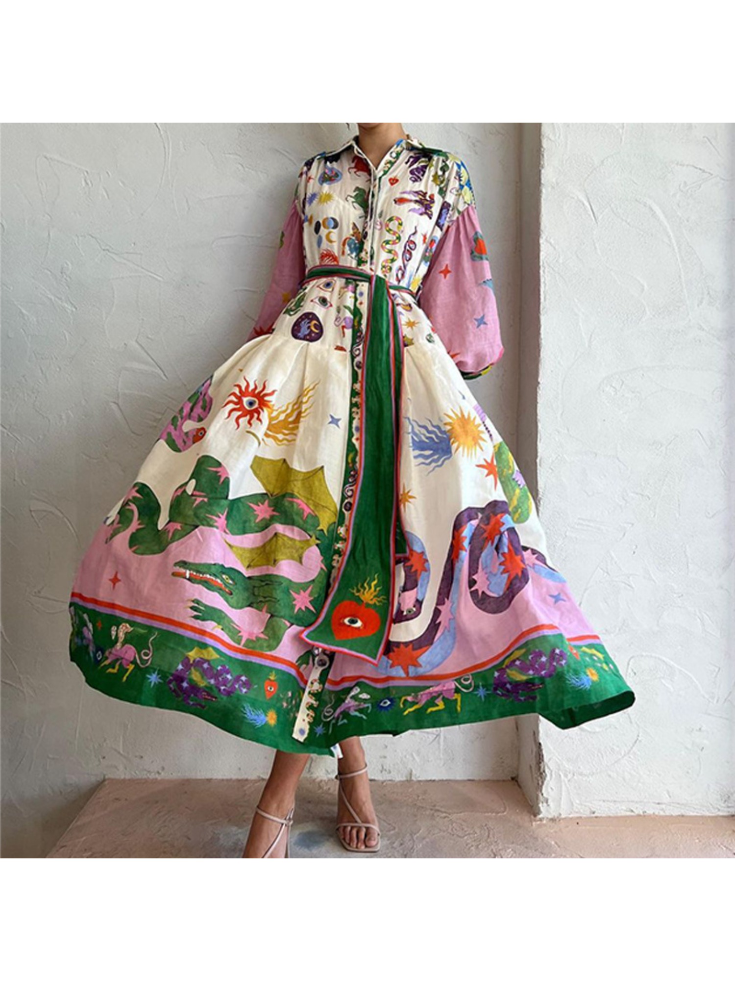 Women'S Retro Patchwork Print Maxi Dress | Belted Long Sleeve Gown for Artistic & Bohemian Chic Style, Geometric-Pattern, Fall/Winter Season, Off the Shoulder Collar, Regular Fit, Flared Hem