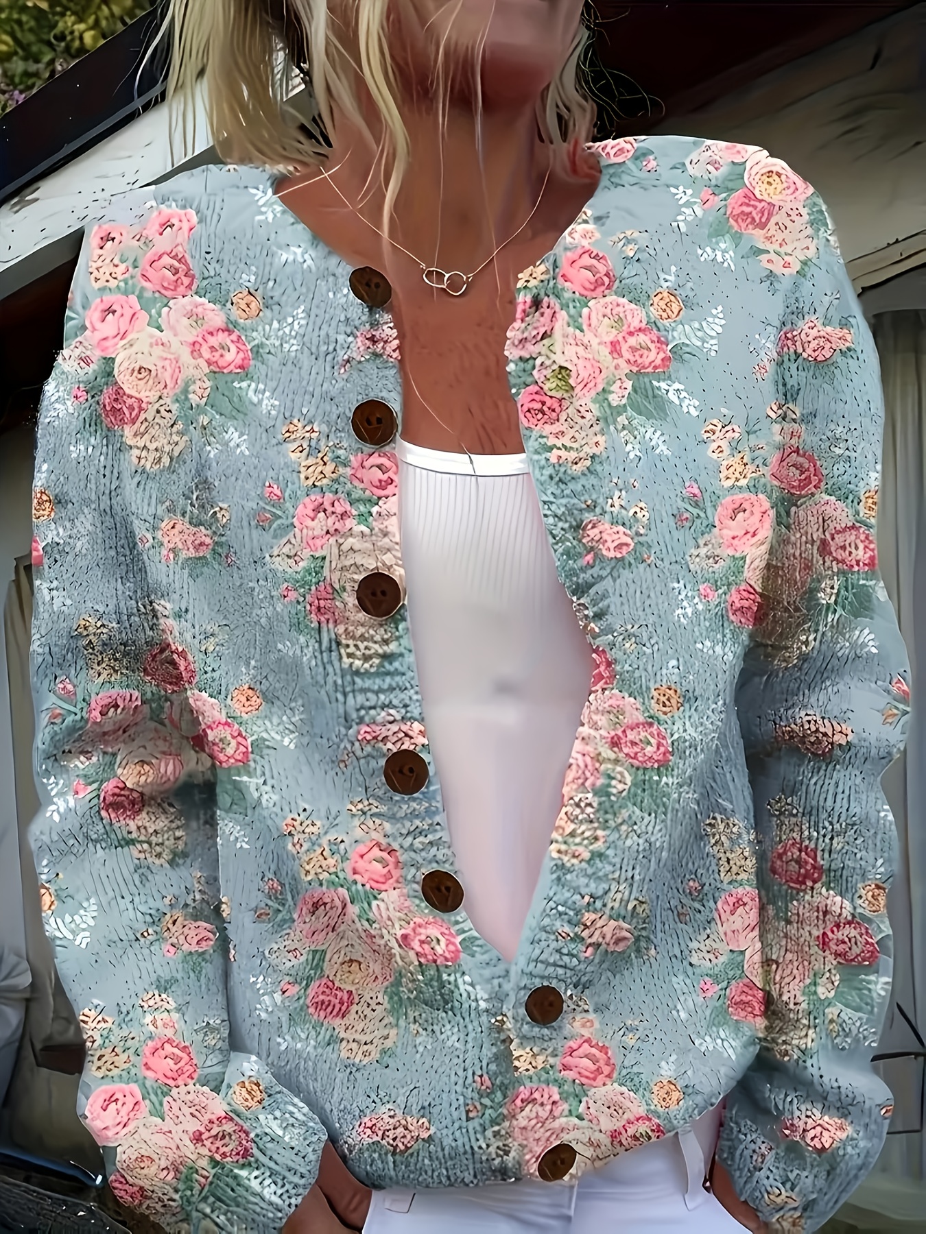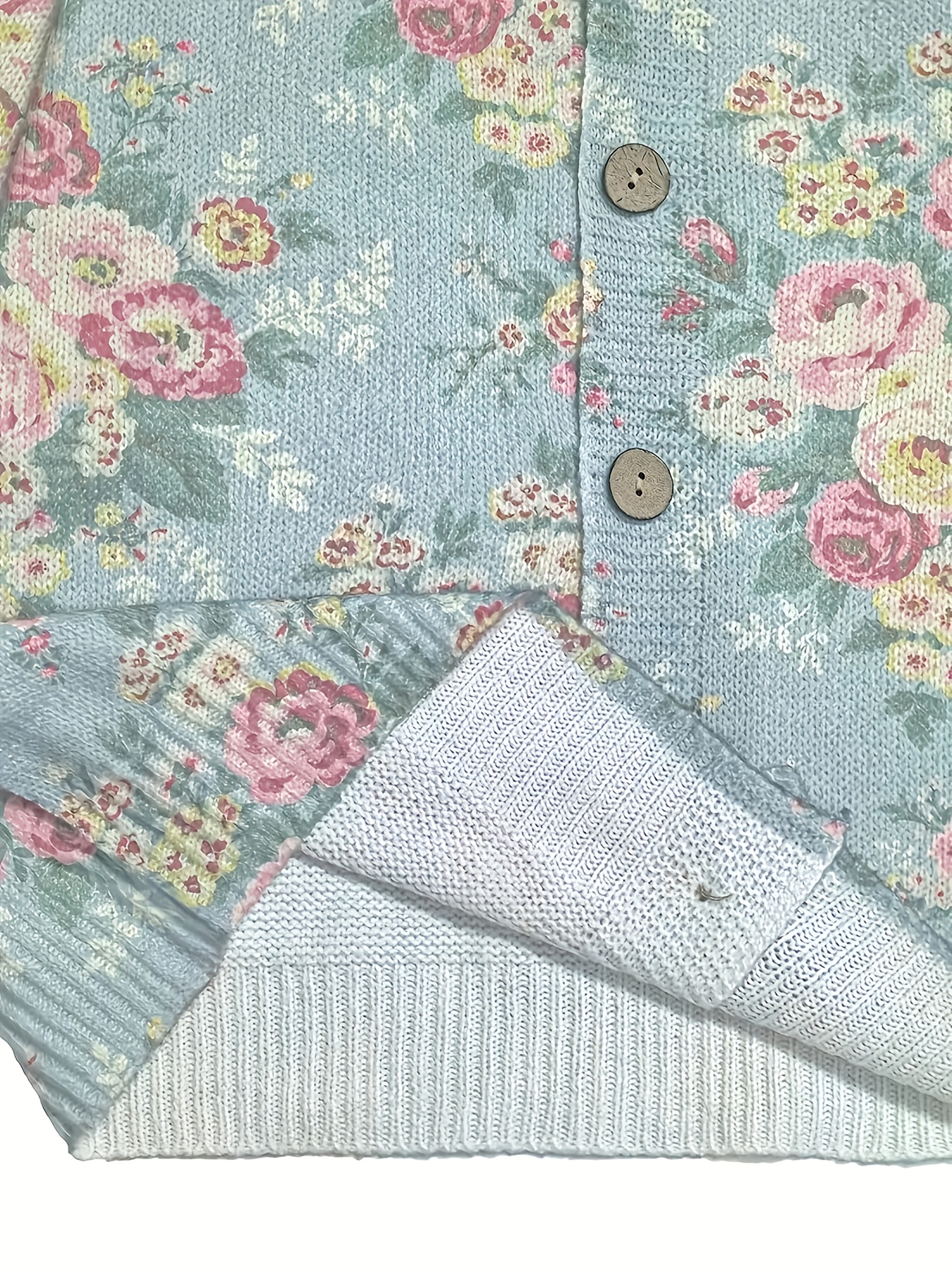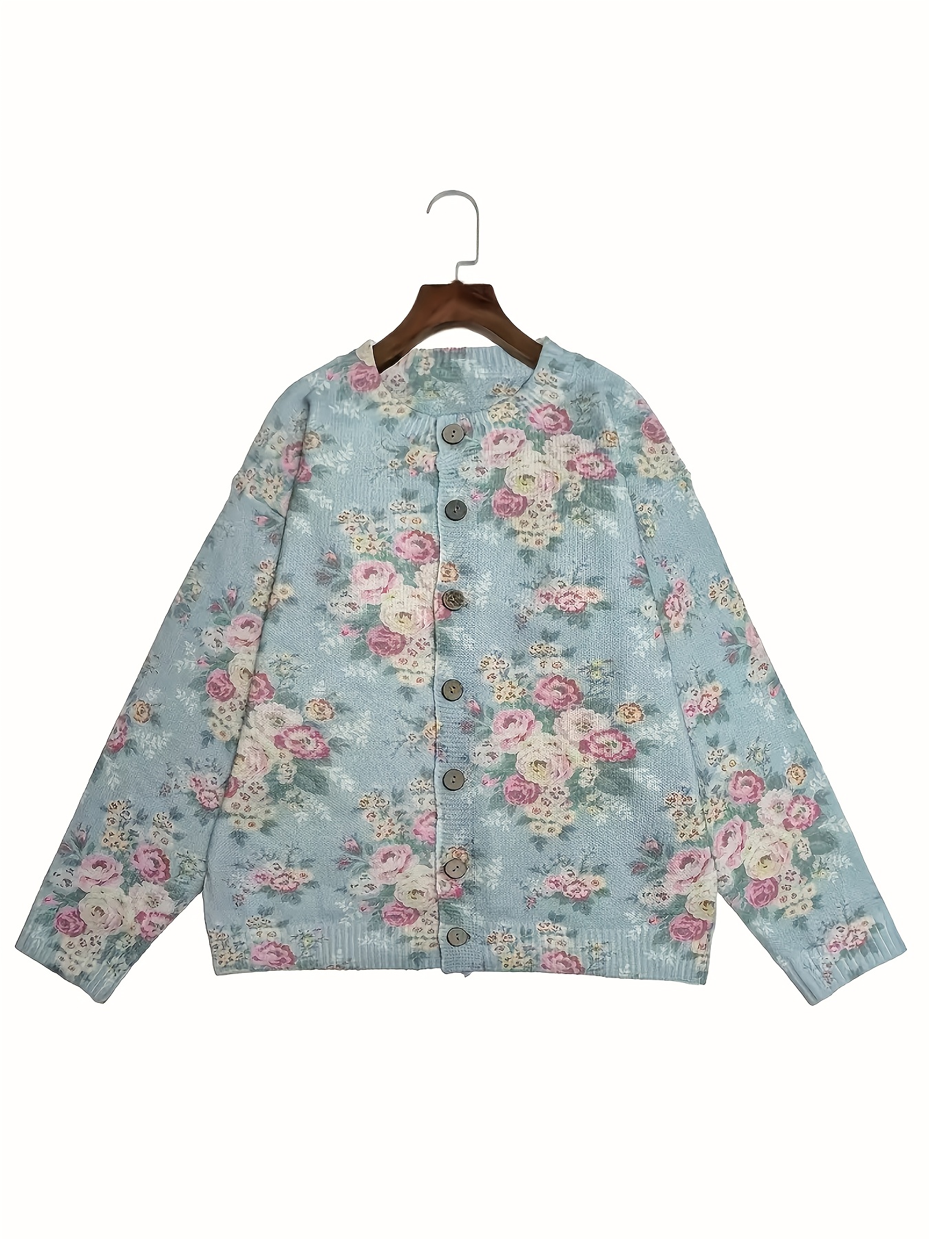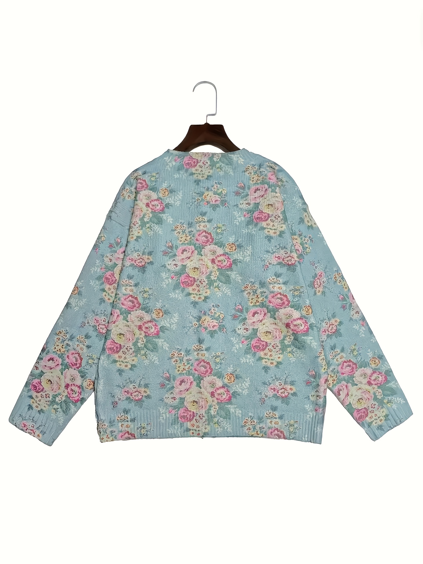Plus Size - Women'S Plus Size 3D Floral Print Cardigan - Pink, White & Light Blue Long-Sleeve Casual Button-Up Jacket, Soft Lightweight Round Neck Layered Top for Spring & Fall, Autumn Outerwear, Spring Outerwear Single Layer Jacket, Lightweight Cardigan, Spring Fall Wear, Round Neck Design, Soft Texture