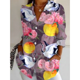 Plus Size Women'S Long Sleeve Butterfly Print Blouse | Black & White Contrast 3D Floral Design, Soft Comfortable Light Beige-Friendly Fabric, Casual Button-Up Shirt for Spring & Fall, Versatile Layering Piece, Allseason Blouse, Floral Print Top