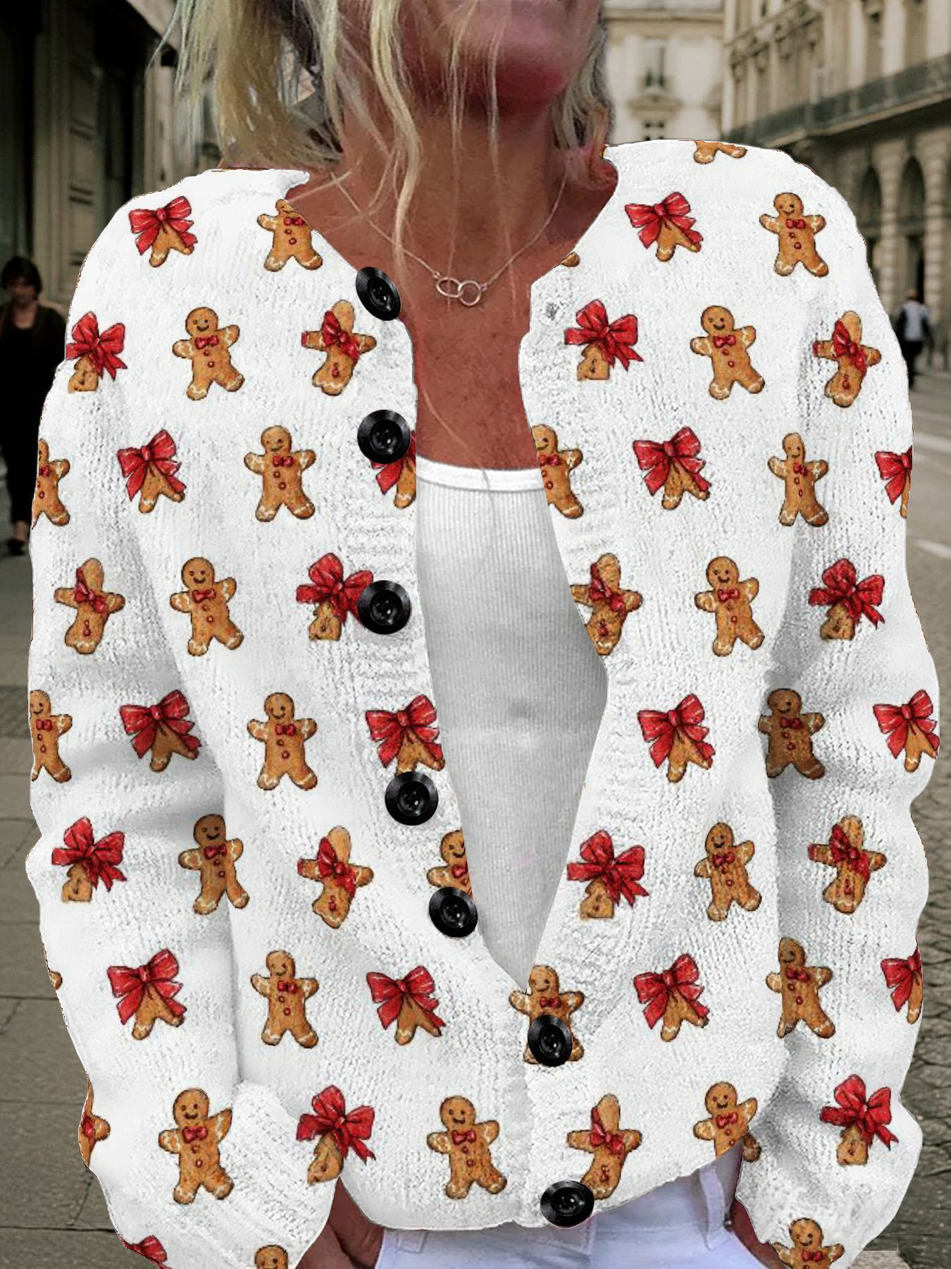 Women's Plus Size Gingerbread Men & Bows Cardigan Sweater - Cozy Stretchy Button-Front Closure, Long Sleeve Winter Sweaters with Gingerbread Print, Christmas Party Outfits, Casual to Semi-Formal Wear, Loose Fit Round Neck