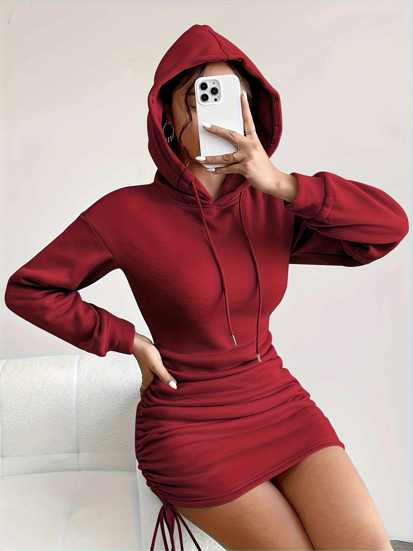 Hooded Ruched Bodycon Dress | Stylish Casual Streetwear with Drawstring Side Detail, Long Sleeve, Midi Length, Perfect for Daily Wear, Parties, Travel, and Fashion Looks