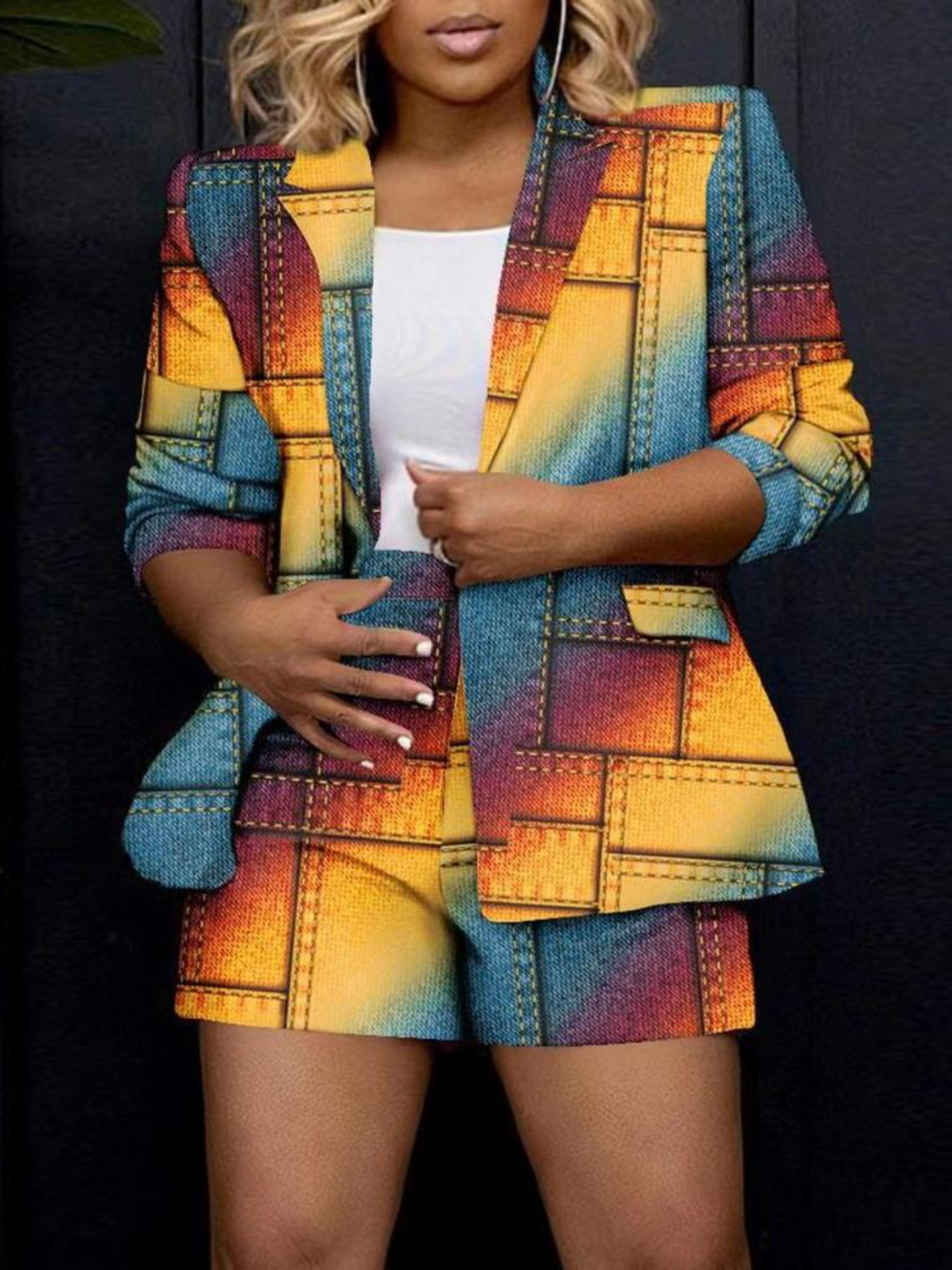 Colorful Patchwork Denim Jacket & Shorts (or short with long sleeves) H-Line All-Season Outfit - Single-Breasted Button Front, Full-Body Multicolor Patchwork, Casual Elegant Style, Machine Washable Denim Ensemble Suitable for Jeans & Dresses