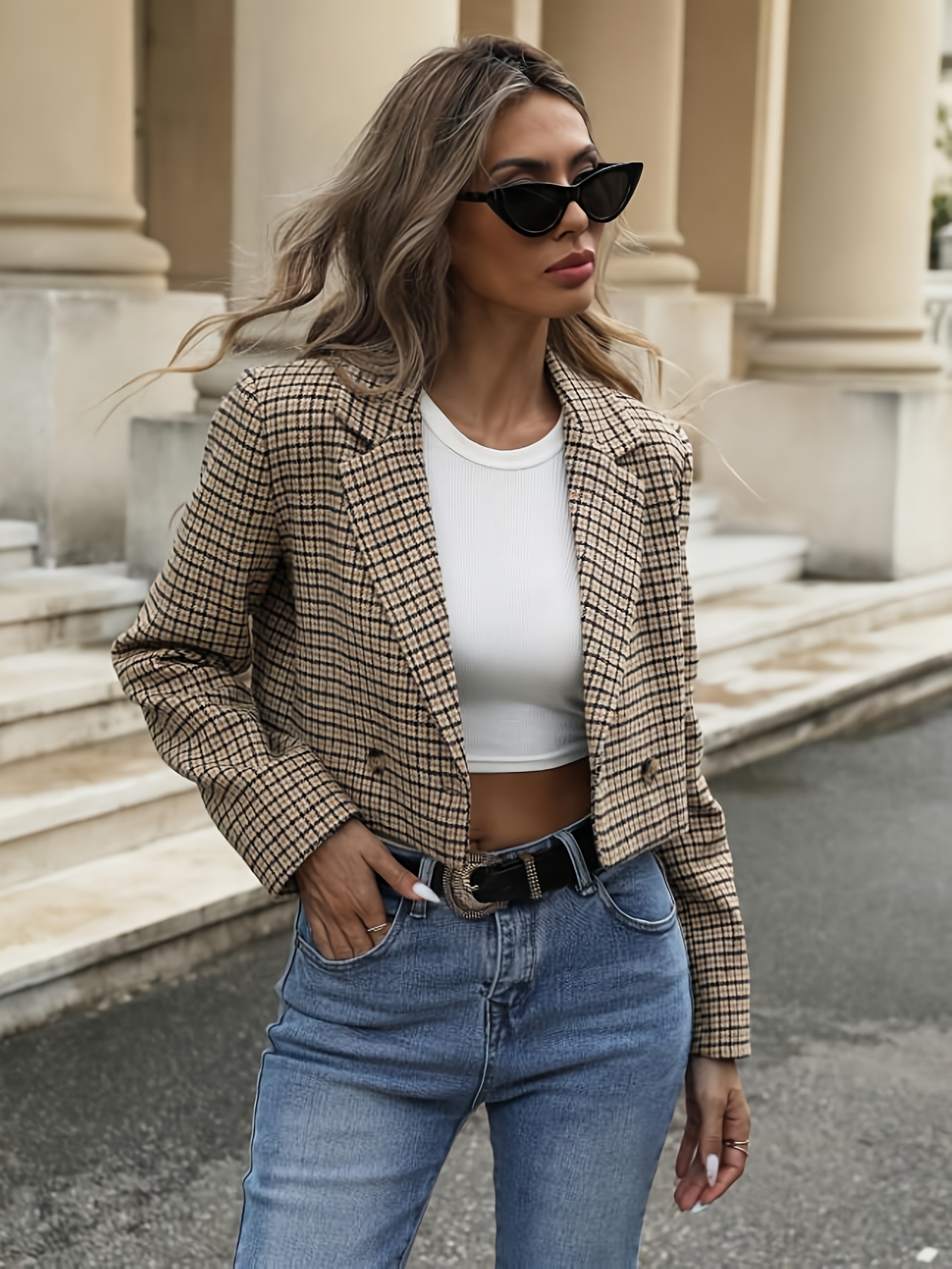 Women'S Houndstooth Blazer Jacket - Elegant Office to Party Coat, Structured H-Silhouette Blazer for Fall/Winter, Button-Front Closure, Professional & Formal Events - Women'S Business Jacket, Winter Outerwear, Stylish Outerwear, Durable Fabric