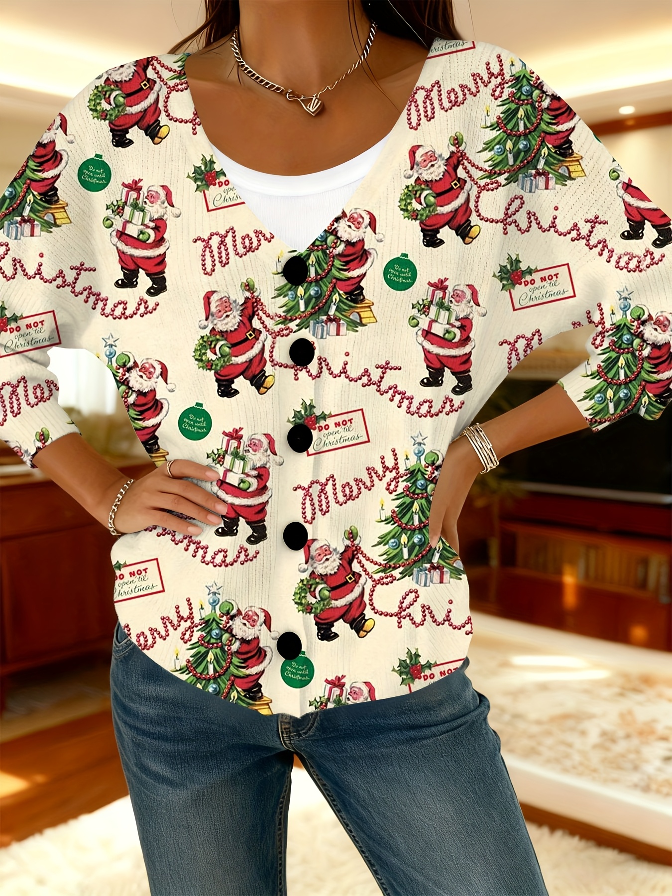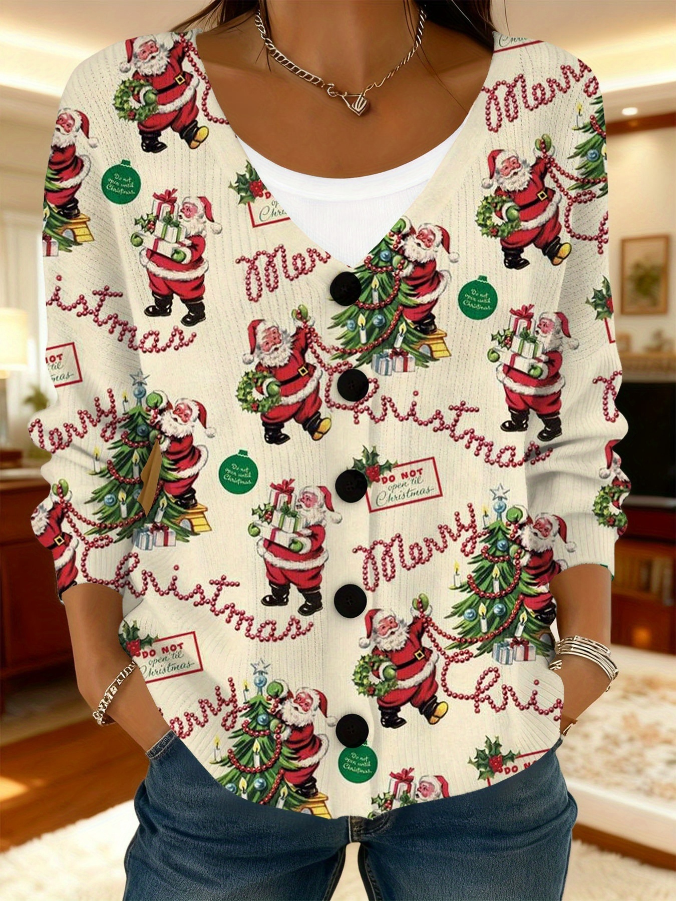 Women'S Vintage Christmas Cardigan - Santa Claus & Reindeer Print Sweater Coat, Loose Fit Long Sleeve Button Front Closure