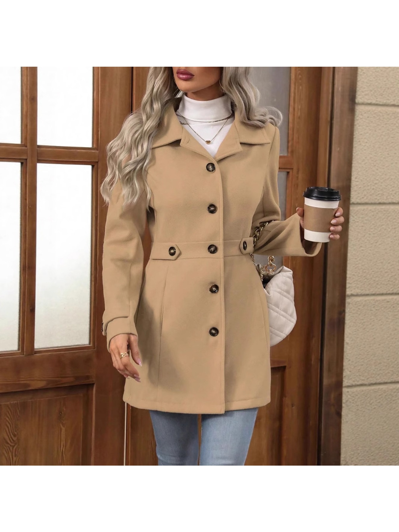 Women's Winter Blend Tweed Trench Coat - Thick Lapel Pea Coat with Single-Breasted Button Front, Slim Fit or Loose (Regular) Length, Machine Washable Dress Overcoat for Business Casual, Office & Casual Attire