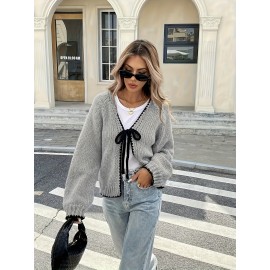 Plus Size - Women'S Plus Size V-Neck Cardigan - Soft, Cozy, and Stylish with Contrast Bow Detail, Long Sleeve, Button-Up Front, Perfect For Fall/winter, Casual Wear, Casual Wear Cardigan | Vneck Cardig