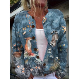 Plus Size - Women'S Cardigan Long Sleeved Jacket Sweater Women'S Casual Cat Print Cardigan- Long Sleeve Round Neck Button Open Front Sweater, Machine Washable Spring And Autumn Layering Top, Durable Shirt