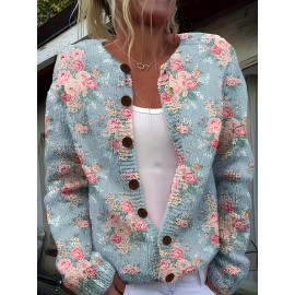 Plus Size - Large Size Women'S Button Sweater | Fashion Button Front Lapel, Plant Art Pattern, All-Season Light Casual Outing, Natural Inspiration Design, Soft Texture, V-Neck, Long Sleeve, Regular Fit