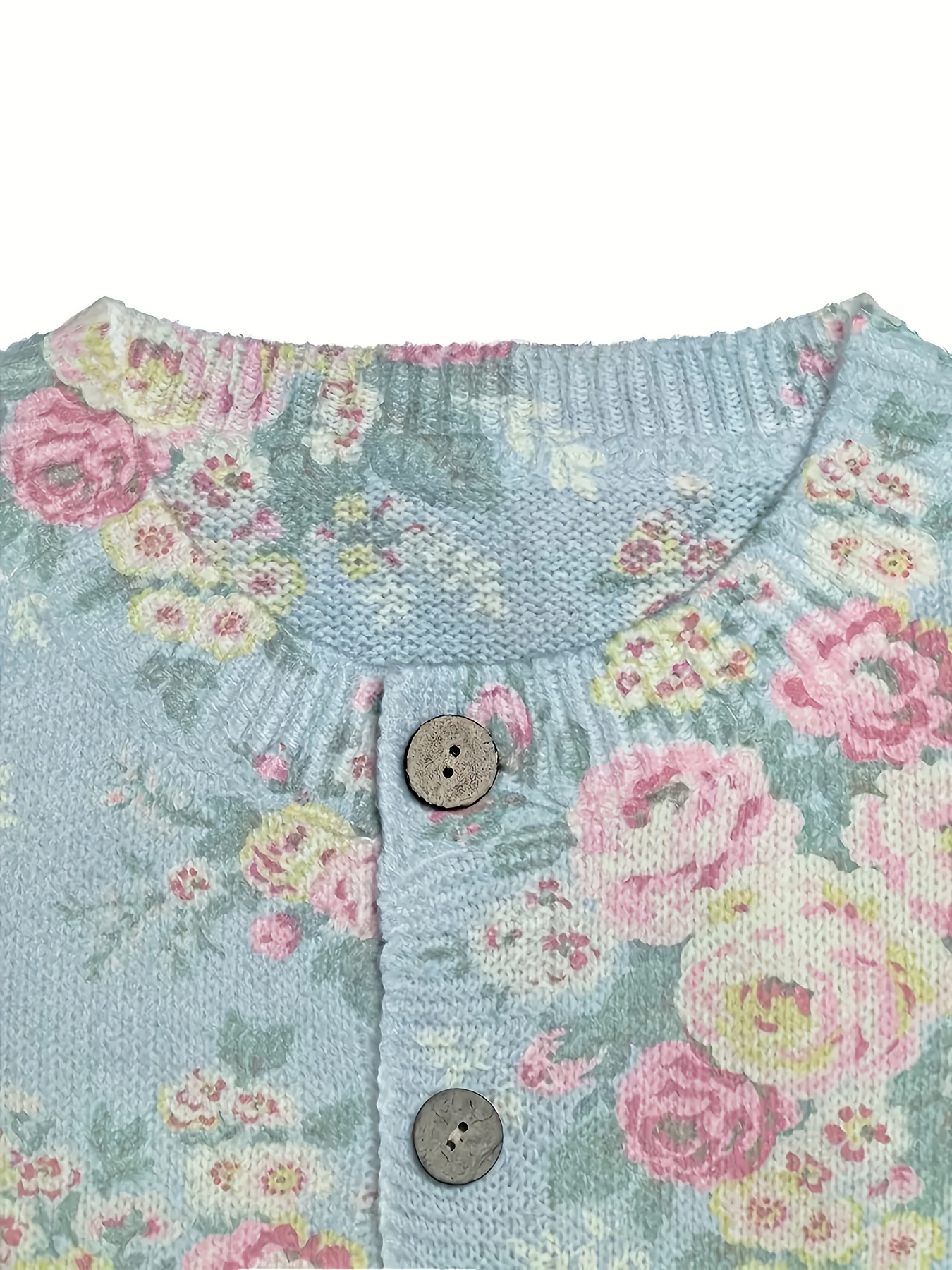 Plus Size - Women'S Plus Size 3D Floral Print Cardigan - Pink, White & Light Blue Long-Sleeve Casual Button-Up Jacket, Soft Lightweight Round Neck Layered Top for Spring & Fall, Autumn Outerwear, Spring Outerwear Single Layer Jacket, Lightweight Cardigan, Spring Fall Wear, Round Neck Design, Soft Texture