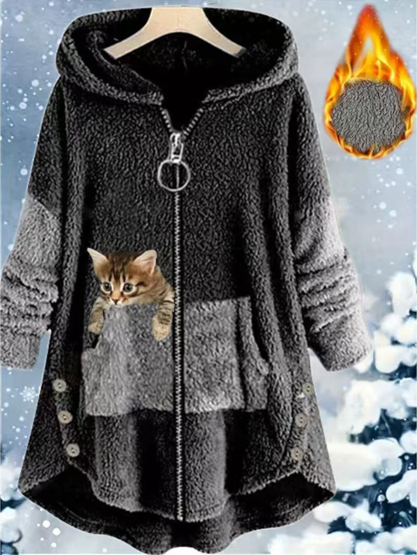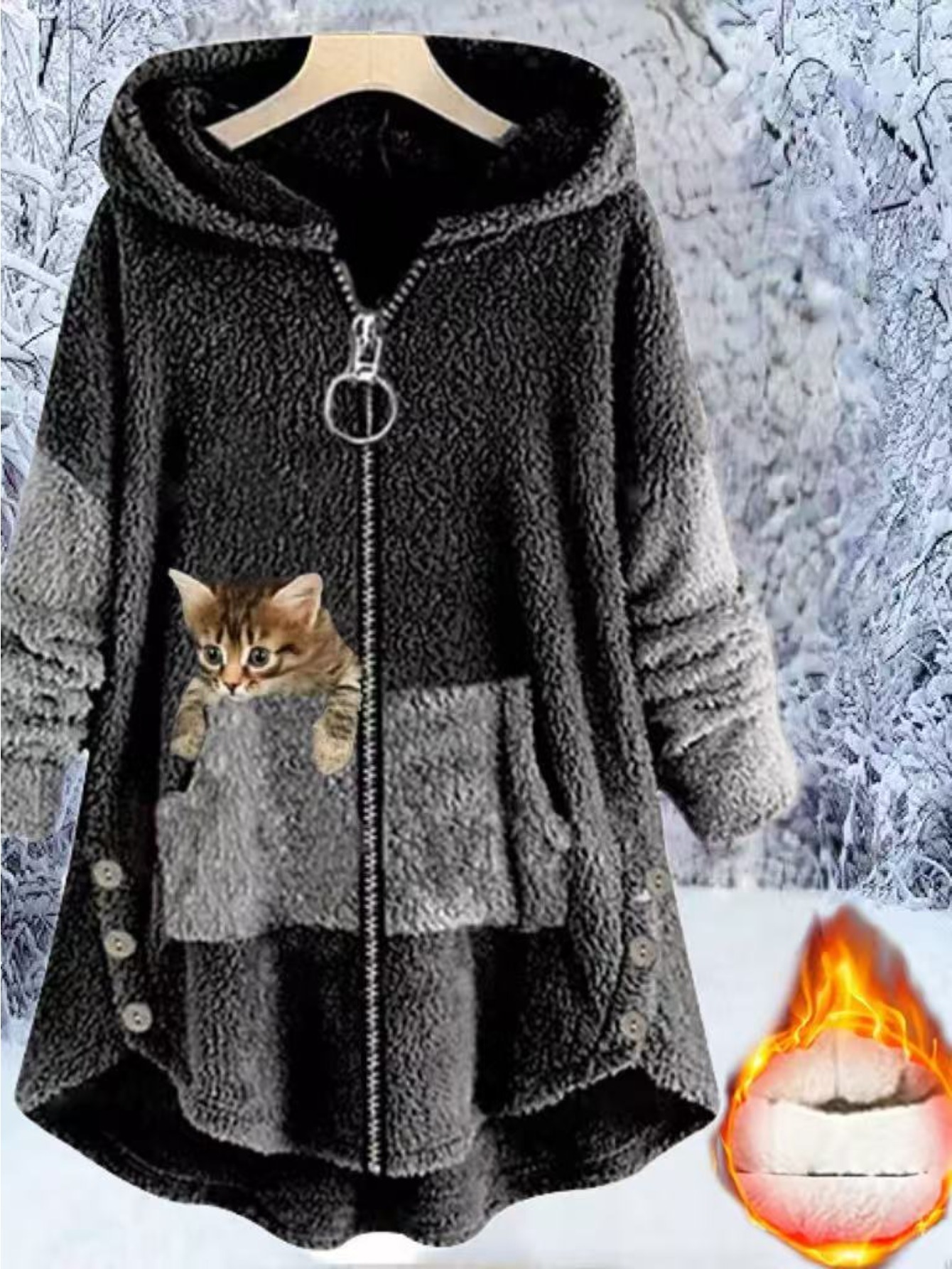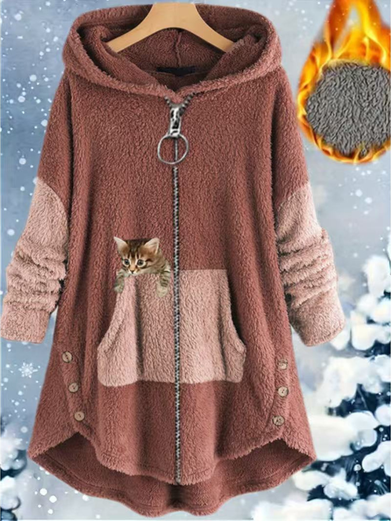 Women's Plus-Size Plush Zip-Up Hooded Jacket with Cat Print & Button Closure - Oversized Winter Warm Coat, Sleeveless Sporty Outerwear for Running, Gym, Casual Outfits - Machine Washable (Brown/Beige/Pink) - Fleece Lining, Pockets, Color Block Design, Relaxed Fit, Suitable for Exercise & Casual Attire, Large Size Casual Sportswear with Plush Material