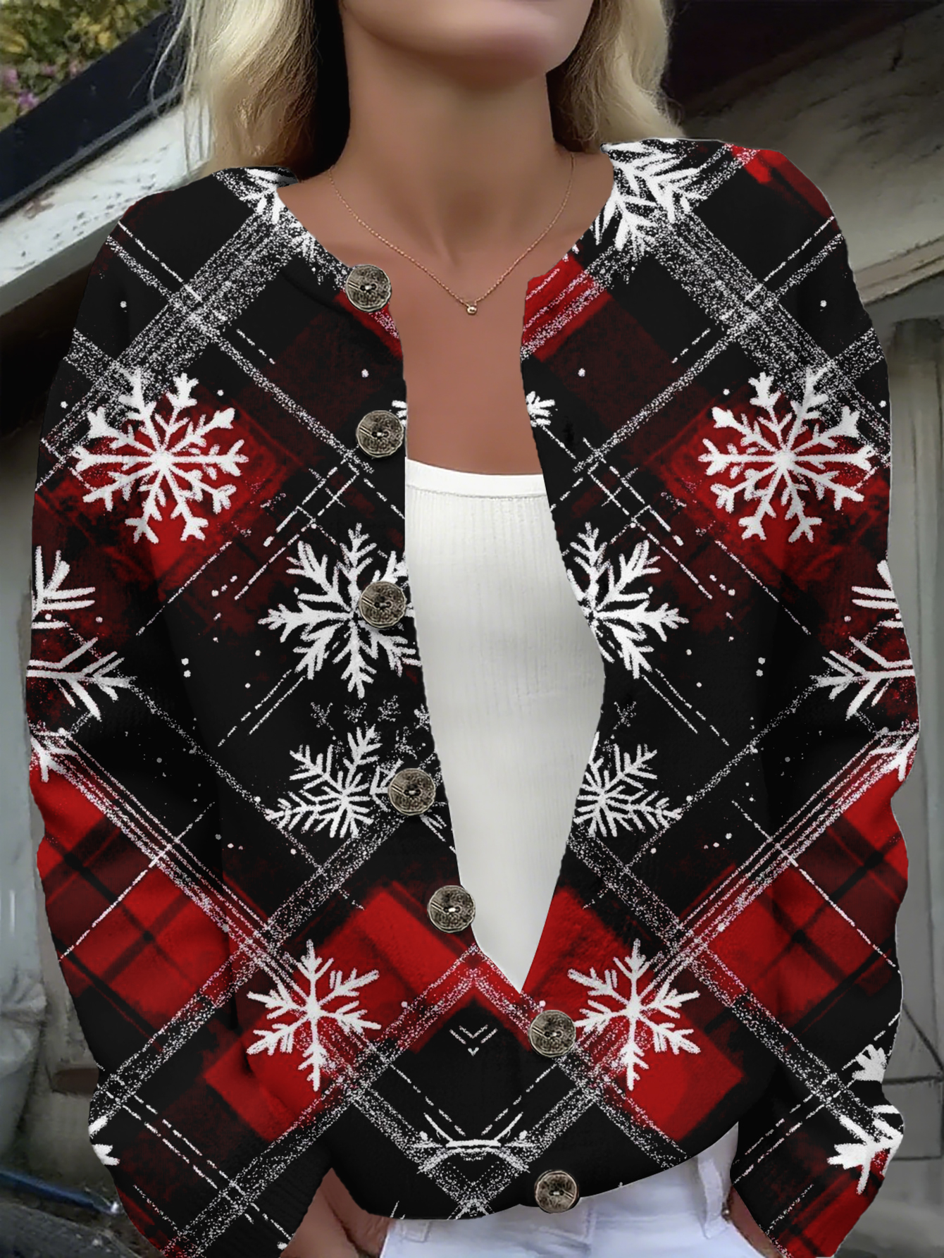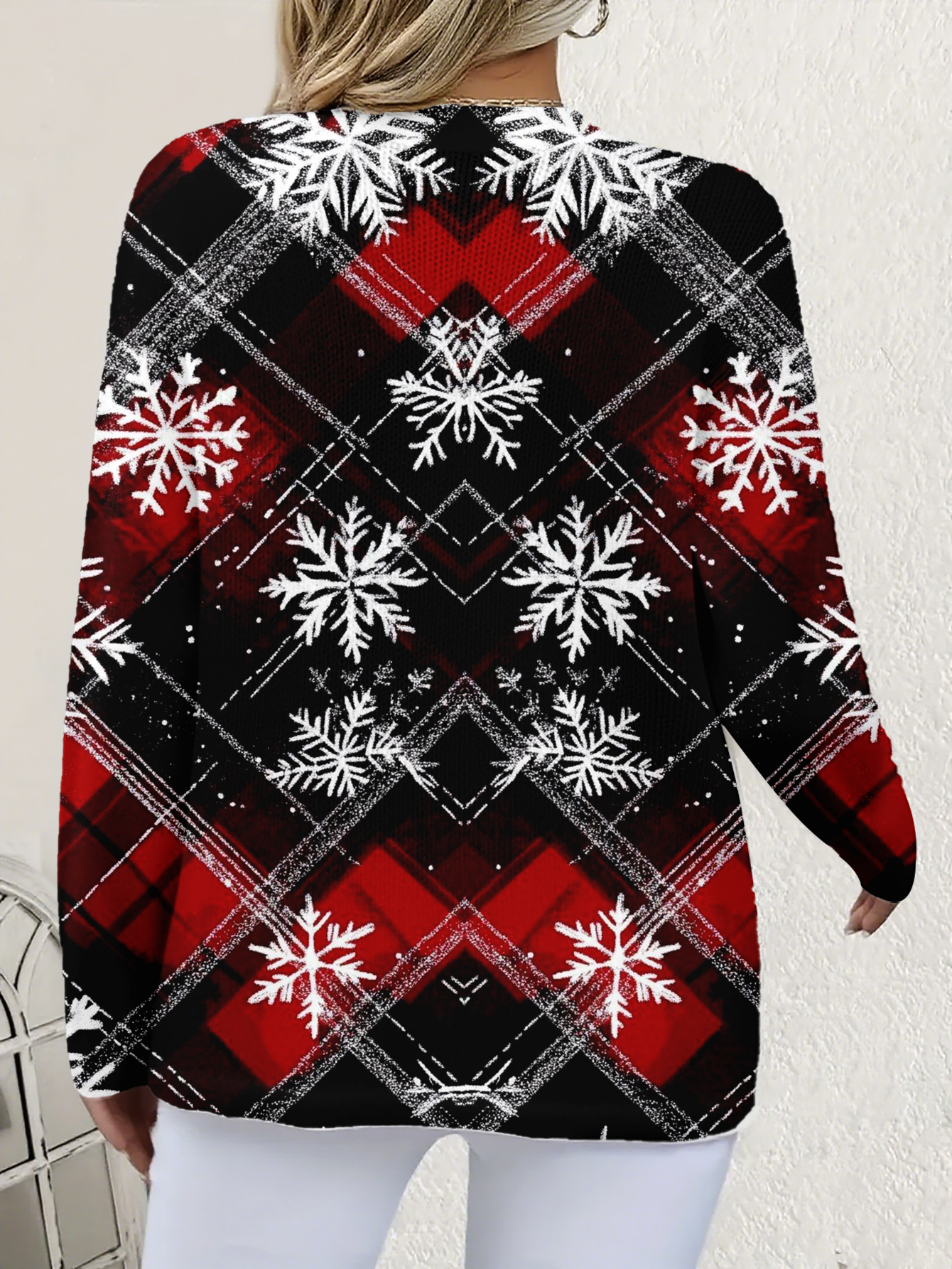 Women's Plus Size Red Black White Plaid Snowflake Cardigan - Faux Sweater Jacket with Golden-Tone Buttons, Winter Warm Coat for Christmas Parties, Layering Piece (Machine Washable) - All-Season Outerwear (Casual to Dressy)