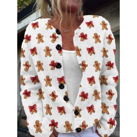 Women's Plus Size Gingerbread Men & Bows Cardigan Sweater - Cozy Stretchy Button-Front Closure, Long Sleeve Winter Sweaters with Gingerbread Print, Christmas Party Outfits, Casual to Semi-Formal Wear, Loose Fit Round Neck