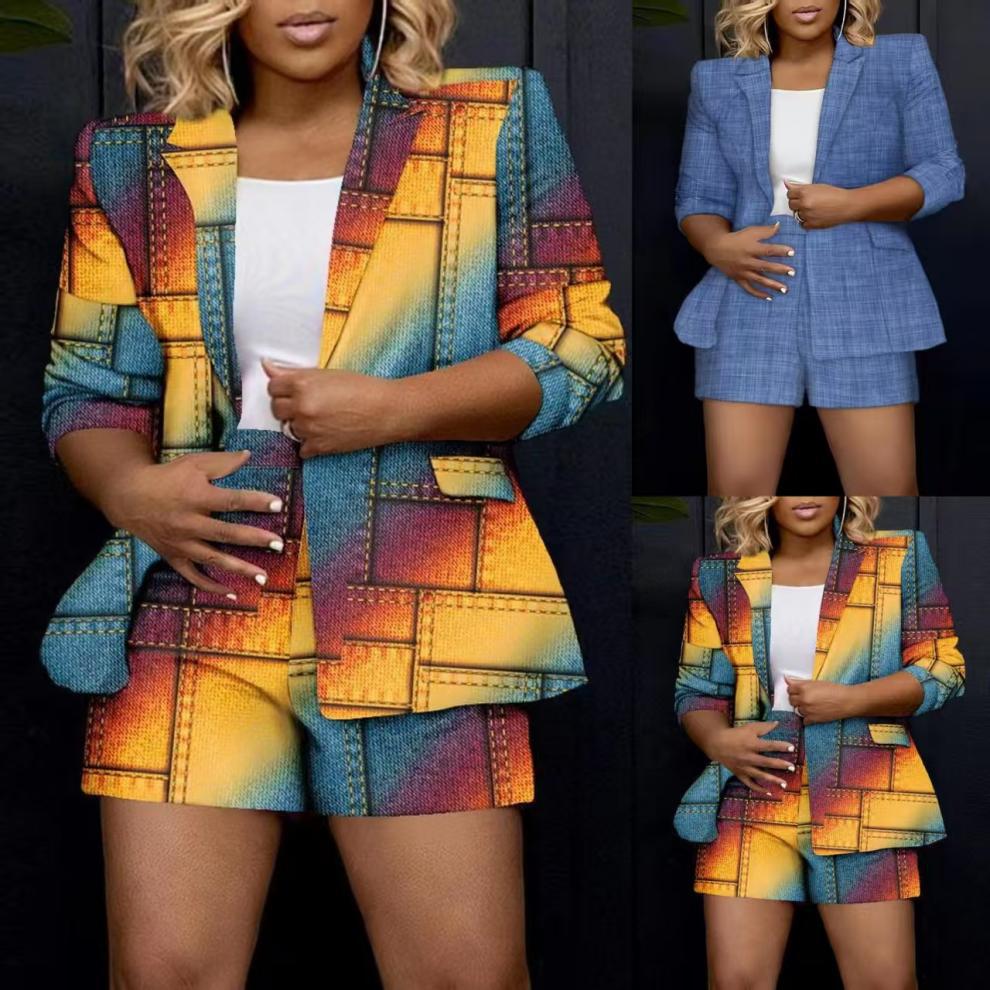 Colorful Patchwork Denim Jacket & Shorts (or short with long sleeves) H-Line All-Season Outfit - Single-Breasted Button Front, Full-Body Multicolor Patchwork, Casual Elegant Style, Machine Washable Denim Ensemble Suitable for Jeans & Dresses