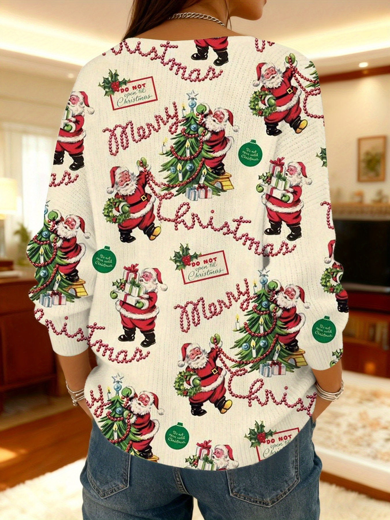 Women'S Vintage Christmas Cardigan - Santa Claus & Reindeer Print Sweater Coat, Loose Fit Long Sleeve Button Front Closure