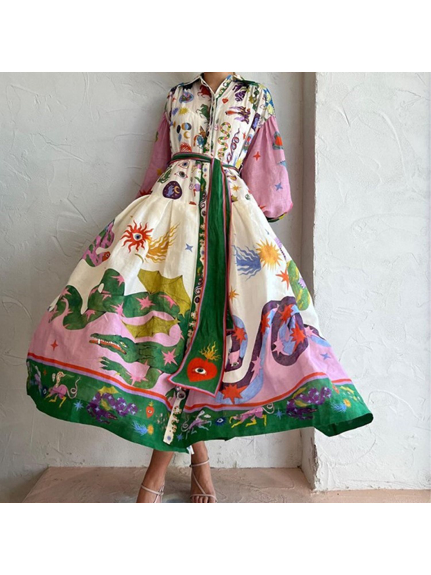 Women'S Retro Patchwork Print Maxi Dress | Belted Long Sleeve Gown for Artistic & Bohemian Chic Style, Geometric-Pattern, Fall/Winter Season, Off the Shoulder Collar, Regular Fit, Flared Hem